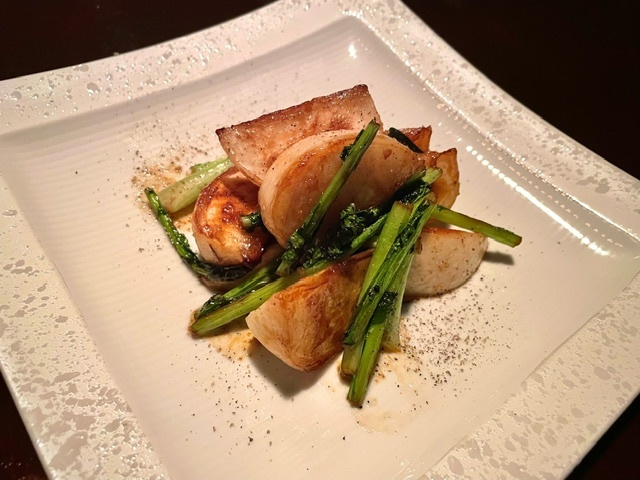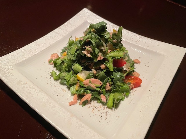 人参とオリーブのマリネ 春菊と柚子とツナのチョップサラダ 4種のキノコのイタリアンパセリ煮込み カブのバター醤油ソテー ゴルゴンゾーラと生ハムのリゾーニ 自家製の生チョコ